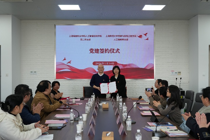 为深入学习贯彻习近平新时代中国特色社会主义思想,推动党建与业务工作深度融合,1月14日下午,学院人工智能党支部与上海城建职业学院人工智能应用学院第二党支部在奉贤校区开展党建联建活动。上海城建职业学院人工智能应用学院副院长、党支部书记朱峰,副院长宋长新,以及党员教师代表来院交流,我院党委副书记、副院长何佳出席活动,人工智能党支部书记安康,以及党员教师参加活动。