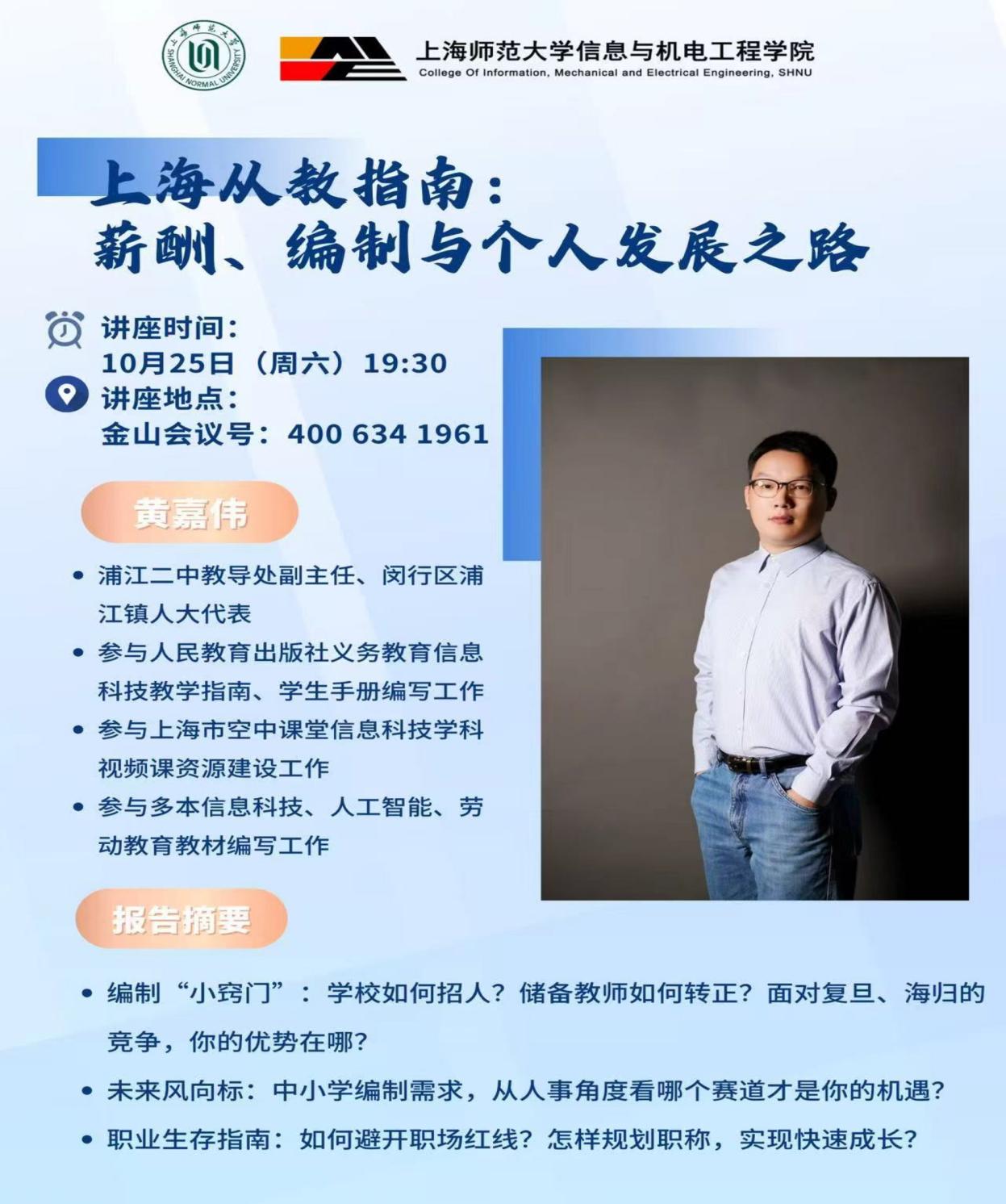 为聚焦师范生就业需求,我院特邀上海市闵行区浦江第二中学教导处副主任、2010 级计算机师范专业毕业生黄嘉伟老师,以线上会议形式开展题为《上海从教指南》的就业专题讲座。讲座历时一个半小时,为即将步入职场的师范生提供了极具针对性的“实战”参考,学院170余名师范专业本科生参加。