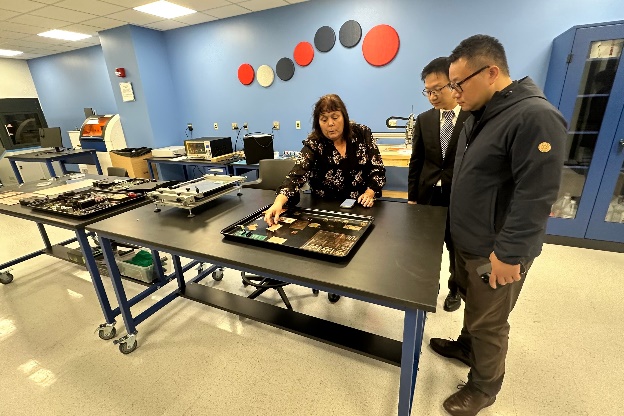 代表团在戴顿大学在读学生和专业教师的陪同下参观了工程学院各专业实验室、工程创新中心、最新的5G无线实验室、激光打印及制造工作坊、课程混合教学空间,了解了5G认证培训、COIL课程教学场景等。