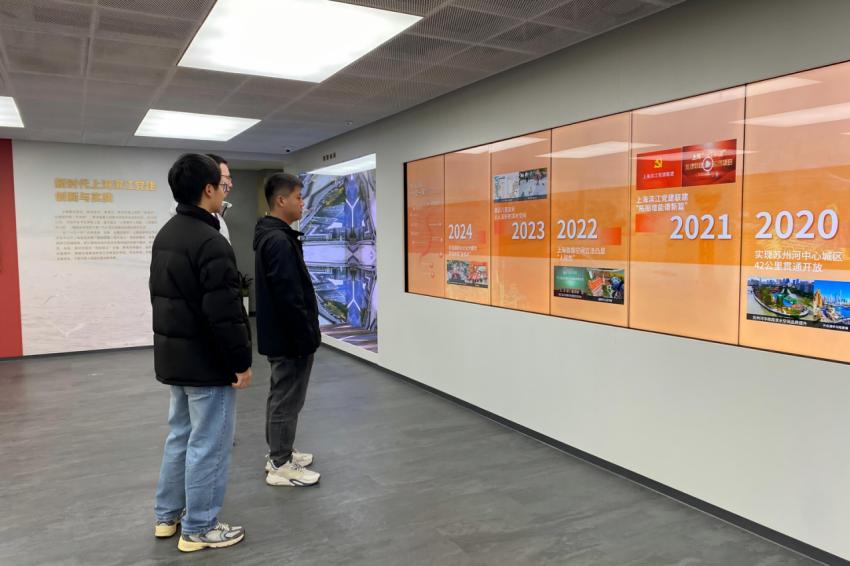 在徐汇滨江党群服务中心,学生党员走进西岸开发陈列展与党群学习空间,系统了解上海西岸从工业岸线到创新高地的规划路径与建设成果。大家沿着“党建引领—城市更新—民生共享”的参观路线,感悟到人民城市理念在滨水公共空间、文化地标与科创载体中得以生动落地。研究生计算机学硕党支部书记聂千龙在参观中感慨:“站在黄浦江畔,我们看见了城市更新的速度,更看见了党领导人民擘画蓝图、砥砺奋进的坚实足迹。这一幕幕生动实践,激励了我们要将个人理想融入时代洪流,以专业所学投身强国建设,在新时代的征程中勇担使命、矢志创新。