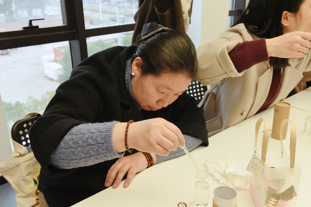参观结束,在专业研发人员的带领下,老师们开展了香水调制体验活动。在讲解环节,专业老师从香文化起源讲起,生动介绍了香水的历史、制作工艺及香味品鉴知识。