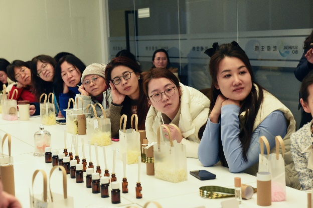 为了更加深入地感受香氛魅力,在专业老师的指导下,大家通过“闻香”仔细分辨前调、中调、后调的奇妙变化,从清新的柑橘调到优雅的花香调,再到沉稳的木香调,每一种味道都仿佛在诉说着独特的故事,老师们凝神静听,沉浸在奇妙的芳香世界里。