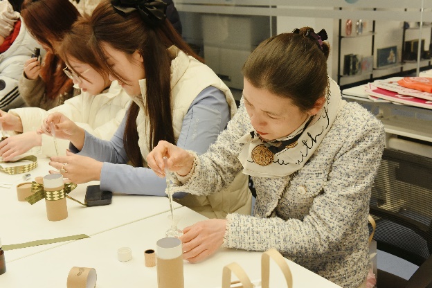 随后的实践环节,老师们化身“调香师”,精心挑选自己心仪的香基,仔细又认真地地调配属于自己的个性香水。有的偏爱淡雅花香,有的钟情氤氲木香。大家时而凝神静思,时而交流品鉴,现场气氛热烈温馨,一瓶瓶独具匠心的香水作品在欢声笑语中诞生,老师们对自己的“作品”都非常满意。